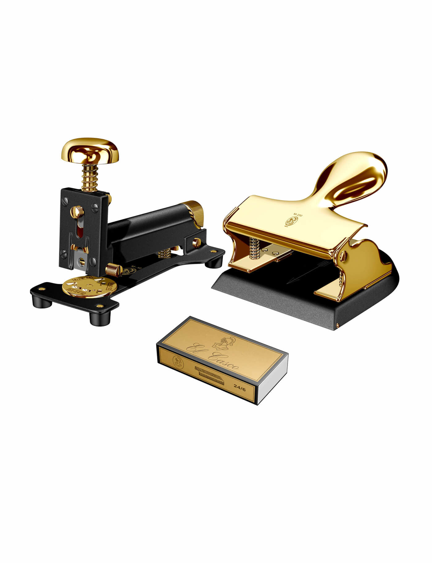 El Casco zımba ve delgeç seti M-10 zımba ve M-200 delgeçten oluşur. Optimal bir organizasyon sistemi için, herhangi bir masadan zımba ve delgeç asla eksik olmamalıdır. M-1 zımba El Casco geleneğini, işçiliğini ve tasarımını korur ve M-200 delgeç yuvarlak tekli ve klasik mekanizma ile ekstra zarafet katar. Her ikisi de siyah lake ve 23kt altın kaplama bileşenlere sahiptir. Bu ofis aksesuarlar tek bir hediye kutusuyla paketlenmiştir ve bir arkadaş veya iş ortamı için ideal bir hediye olabilir.