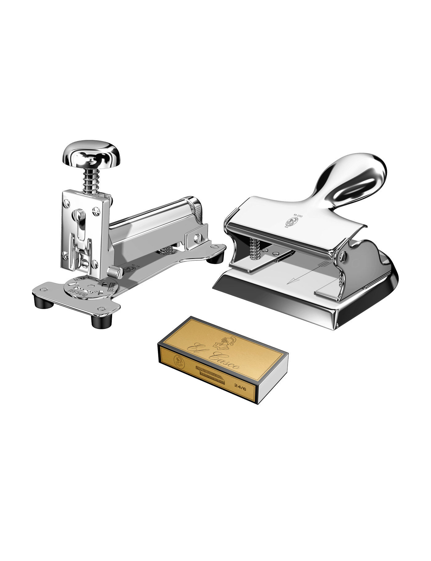 El Casco zımba ve delgeç seti M-15 zımba ve M-200 delgeçten oluşur. Optimal bir organizasyon sistemi için, herhangi bir masadan zımba ve delgeç asla eksik olmamalıdır. M-15 zımba El Casco geleneğini, işçiliğini ve tasarımını korur ve M-200 delgeç yuvarlak şekli ve klasik mekanizma ile ekstra zarafet katar. Her ikisi de siyah lake ve 23kt altın kaplama bileşenlere sahiptir. Bu ofis aksesuarları tek bir hediye kutusuyla paketlenmiştir ve bir arkadaş veya iş ortamı için ideal bir hediye olabilir.