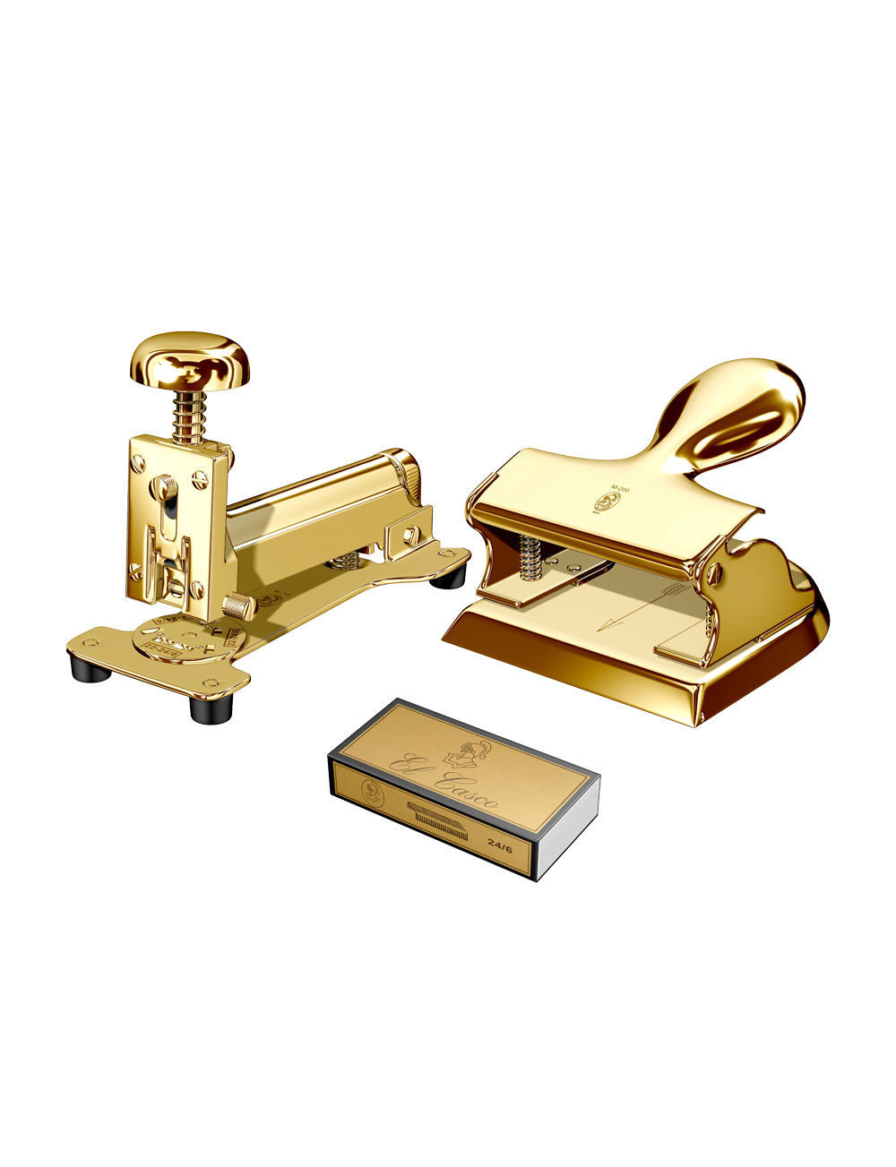 El Casco zımba ve delgeç seti M-15 zımba ve M-200 delgeçten oluşur. Optimal bir organizasyon sistemi için, herhangi bir masadan zımba ve delgeç asla eksik olmamalıdır. M-15 zımba El Casco geleneğini, işçiliğini ve tasarımını korur ve M-200 delgeç yuvarlak şekli ve klasik mekanizma ile ekstra zarafet katar. Her ikisi de siyah lake ve 23kt altın kaplama bileşenlere sahiptir. Bu ofis aksesuarları tek bir hediye kutusuyla paketlenmiştir ve bir arkadaş veya iş ortamı için ideal bir hediye olabilir.